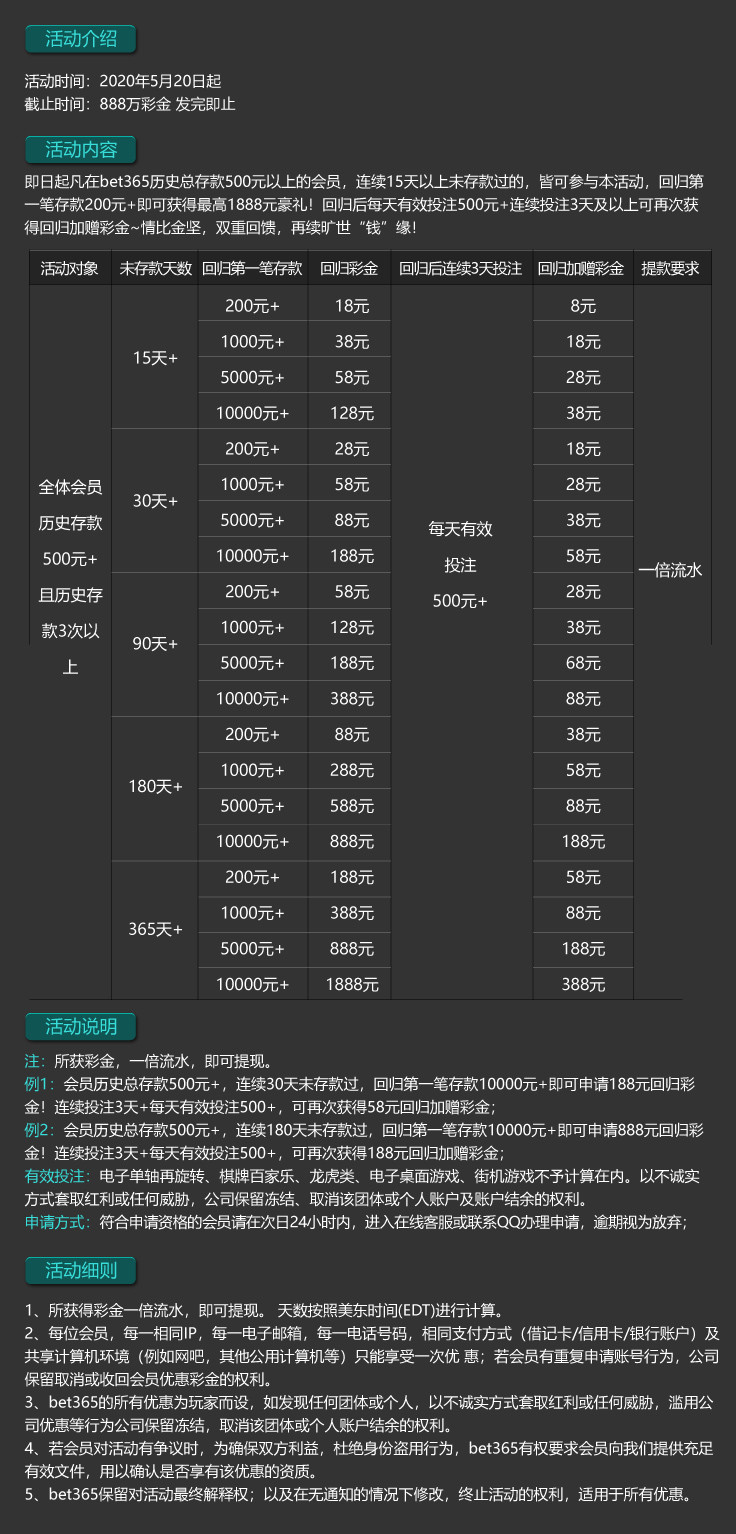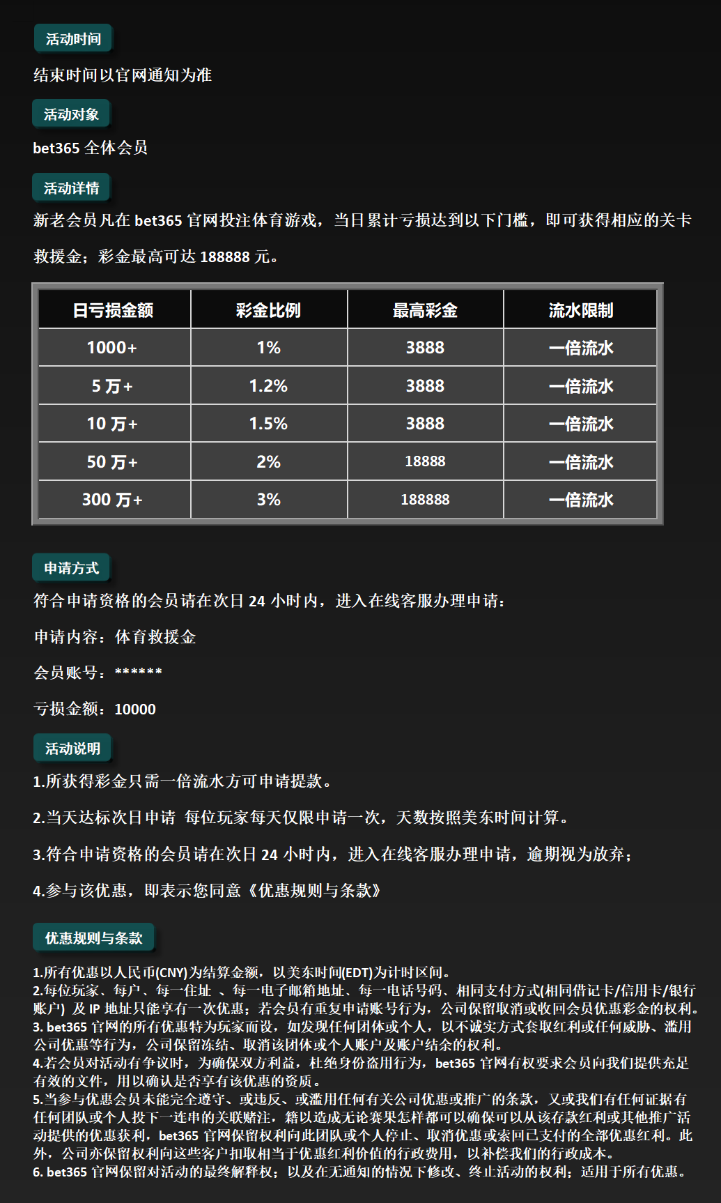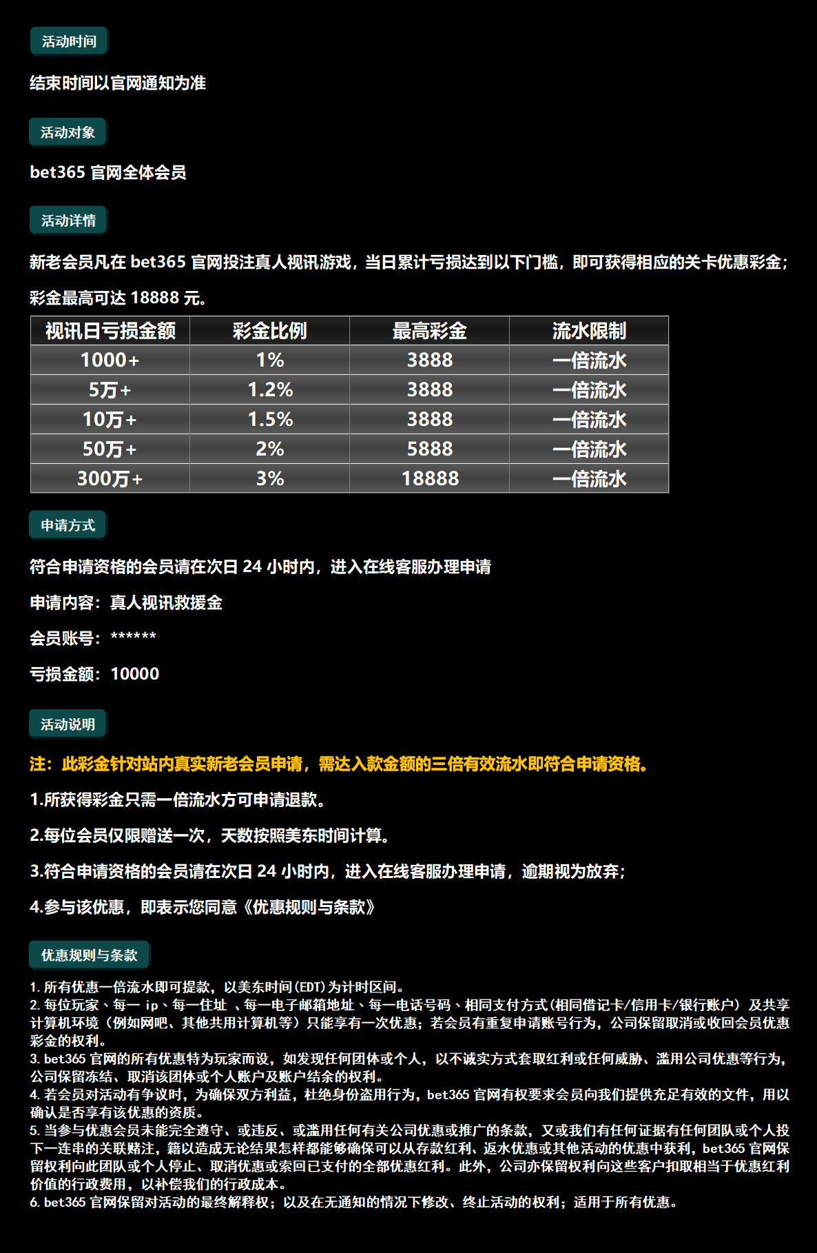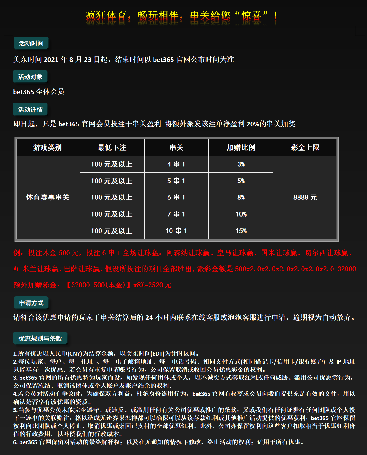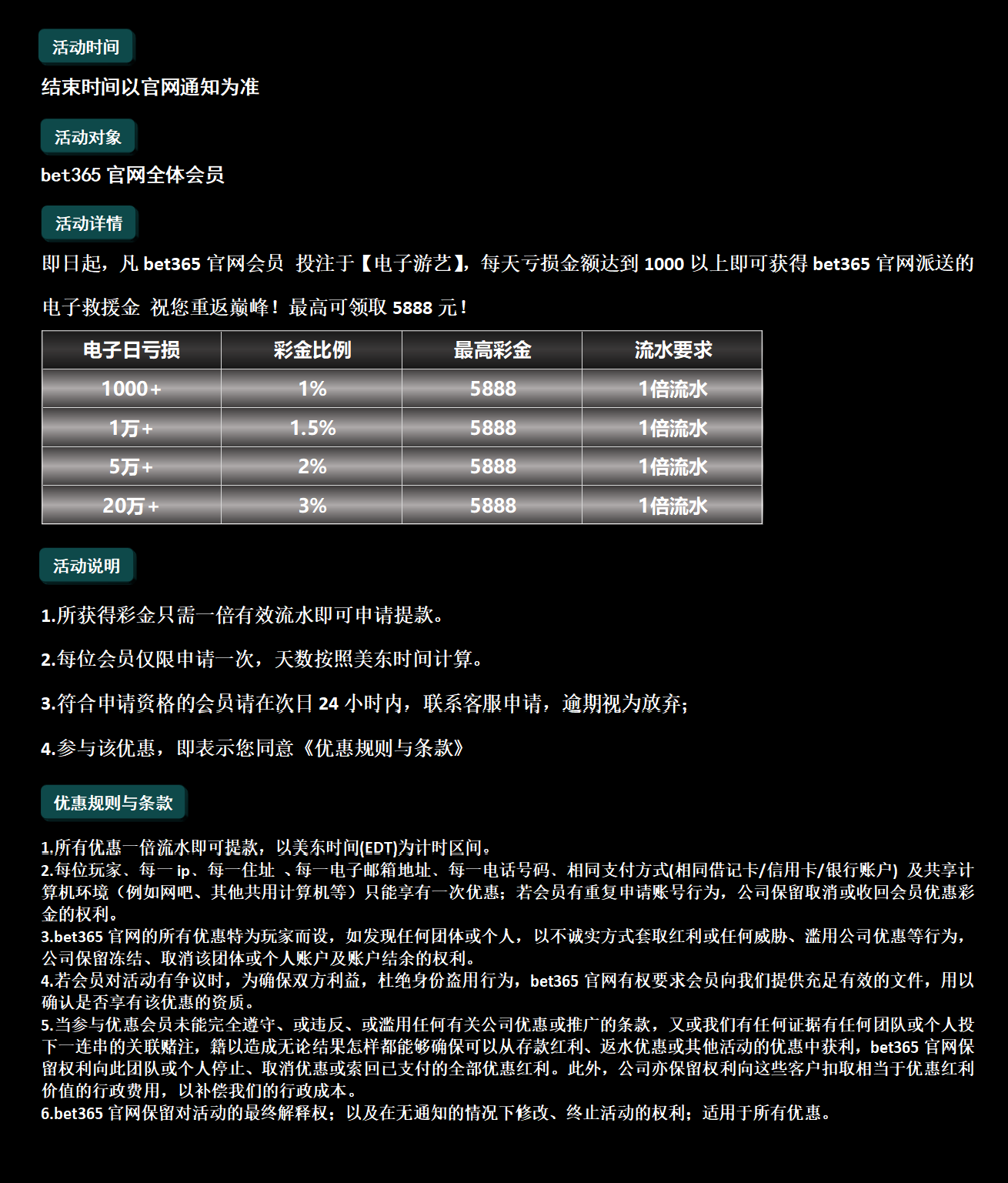 6. Bet365官网保留对活动的最终解释权;以及在无通知的情况下修改、终止活动的权利;适用于所有优惠。