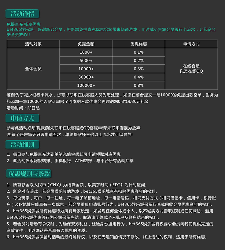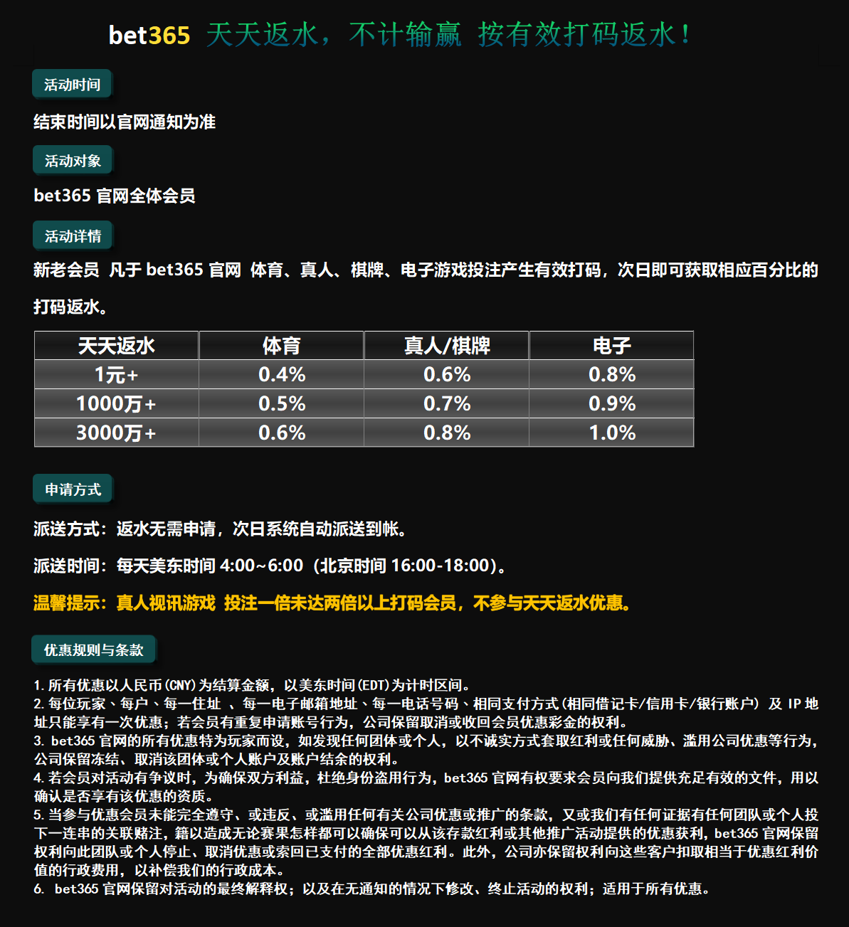 3. Bet365官网的所有优惠特为玩家而设,如发现任何团体或个人,以不诚实方式套取红利或任何威胁、滥用
